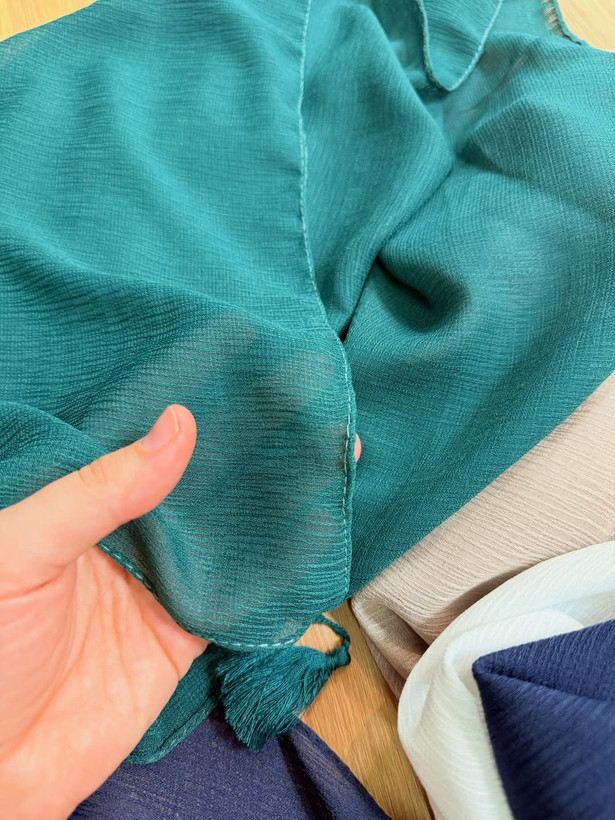 روسری نخی درختی ساده ی تک رنگ قواره حدودا ۱۴۰ دورچرخ دوز چهارطرف منگوله دار ایستایی خوبی روی شانه داره هم به صورت تیز و هم به صورت گرد ایستایی دارد حالت پفکی ندارد دوندون و پرز نمیشه درگ فوق العاده جذاب.