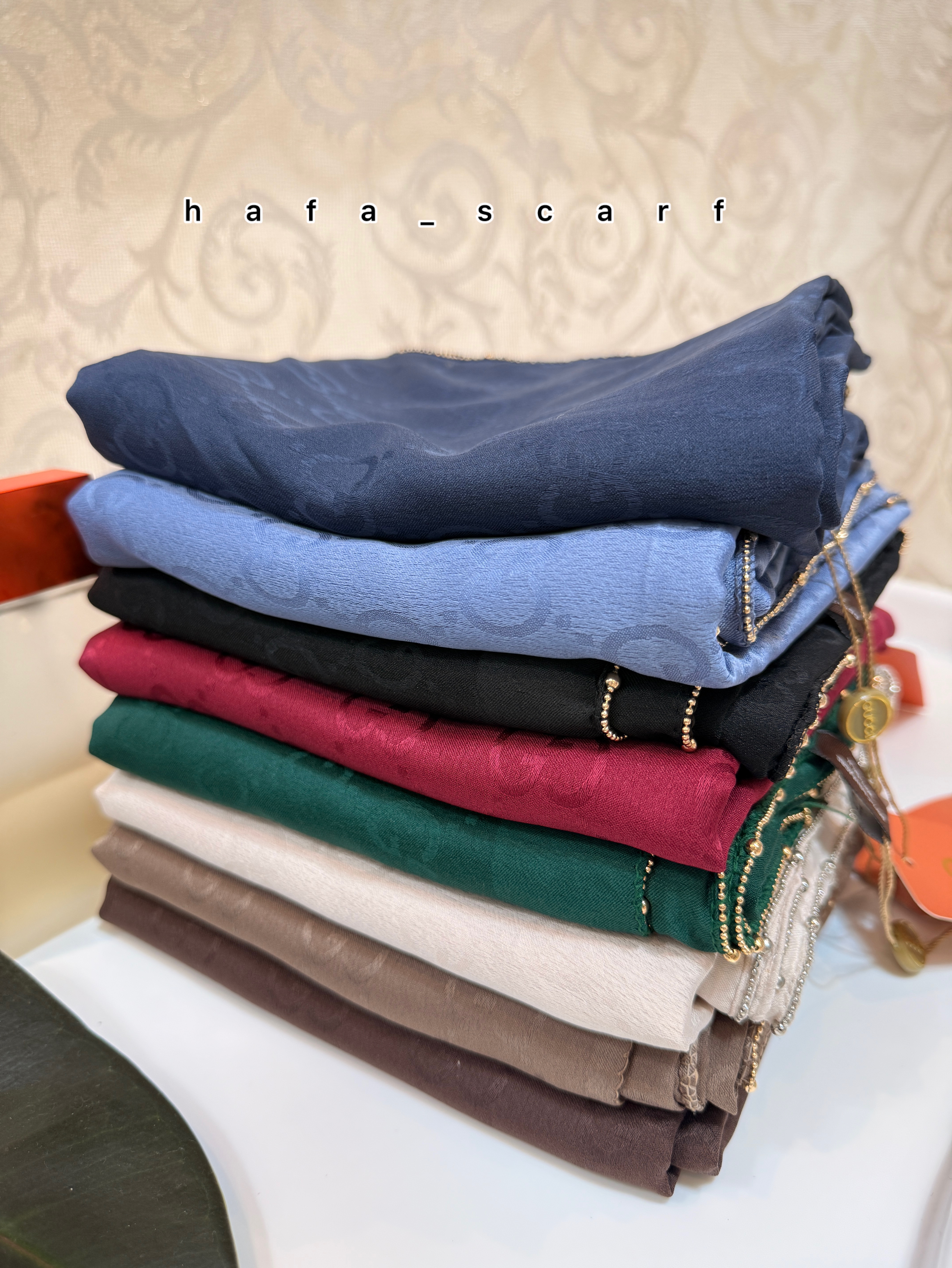 روسری ژاکارد مارک حاشیه زنجیر دار وارداتی کیفیت عالی بالای سر به صورت تیز و گرد حالت میگیره حاشیه کار باعث ایستایی بهتری نسبت به ژاکارد های دیگر دارد.
